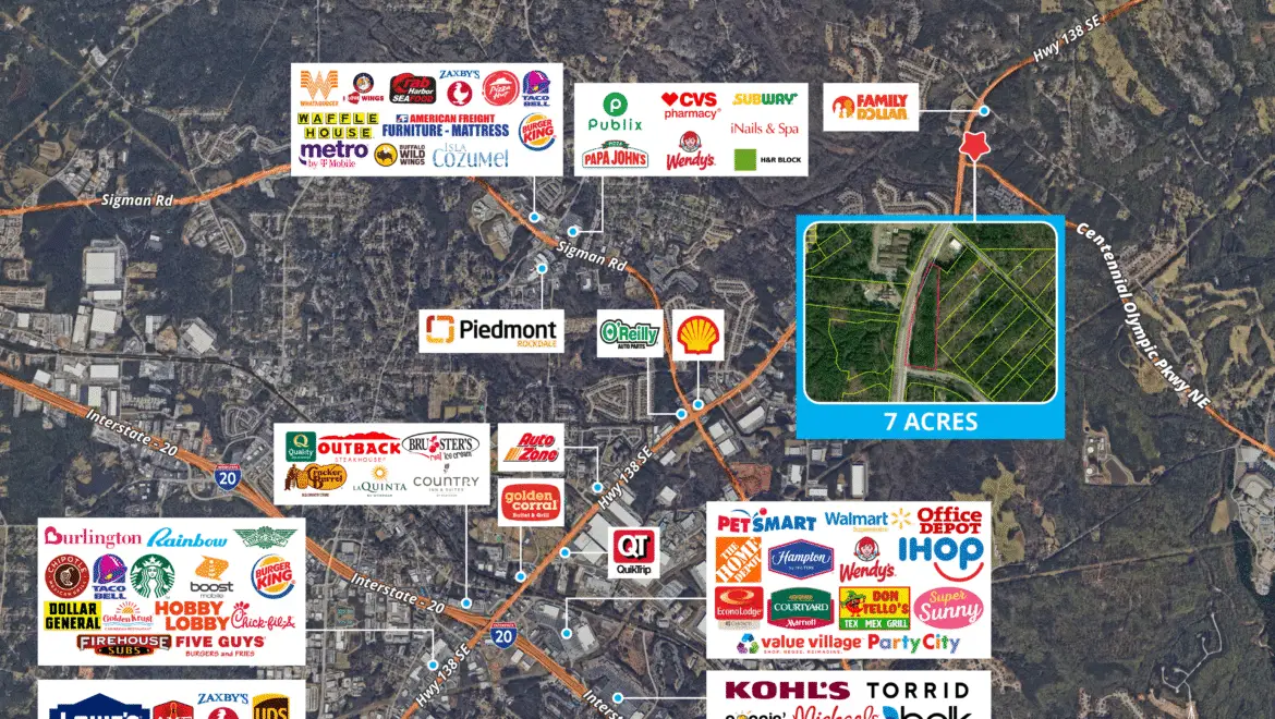 Positioned at the highly visible intersection of Highway 138 and Centennial Olympic Parkway in Conyers, Georgia, this ±7.58-acre C-1 zoned parcel offers a prime opportunity for commercial development in one of metro Atlanta’s fastest-growing corridors.